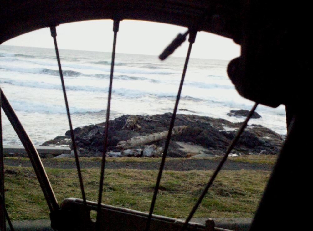 This afternoon I drove over to Yachats to see the ocean and to take a ride in a brief window of clear skies before the rain returned. Strong winds seemed to be making the surf larger than normal. Or was it the tsunami? Clearly not much danger here, for me on the land, though the Coast Guard warned that currents were unpredictable at sea.