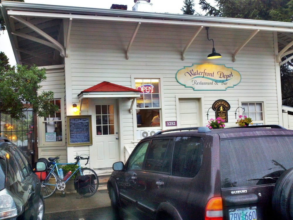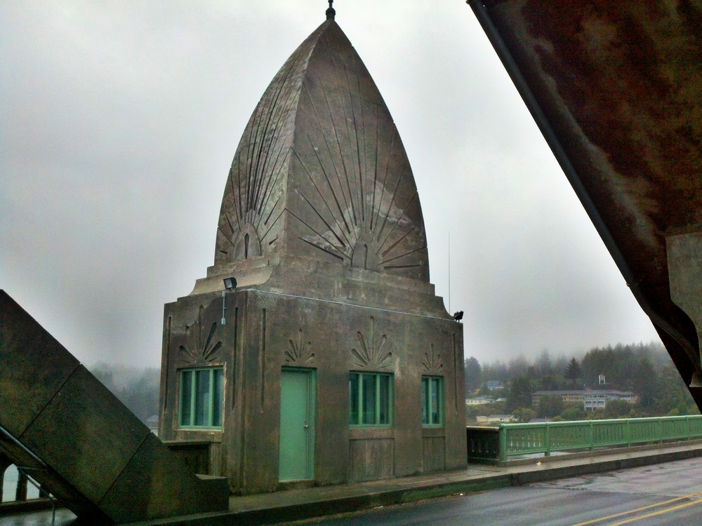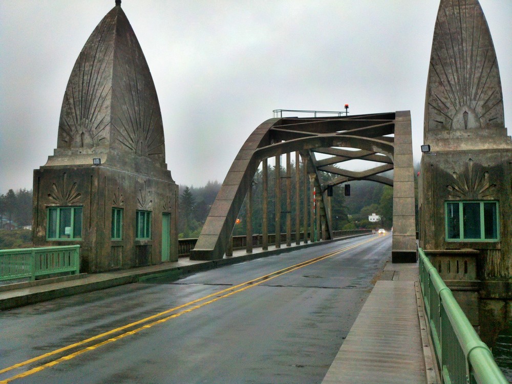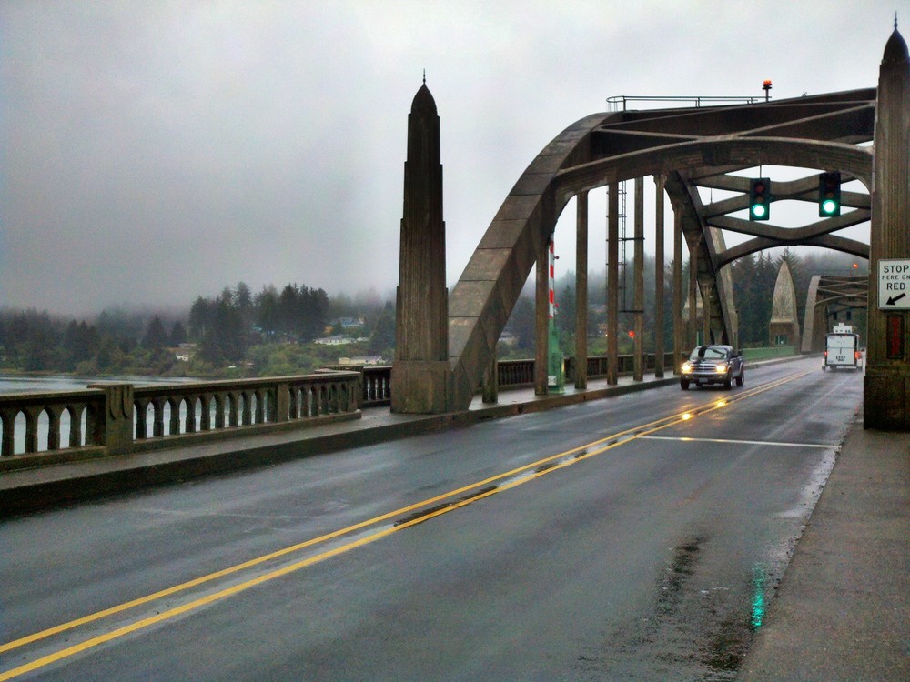 But I was too wet and cold to contemplate camping. So I made a quick motel reservation, then headed to the Waterfront Depot, for a cozy, warm dinner at one of my favorite restaurants. Then crossing the Siuslaw Bay on another of Conde McCullough’s masterpiece bridges, I rolled off to the motel to a hot shower, laundry and a night in a real bed.