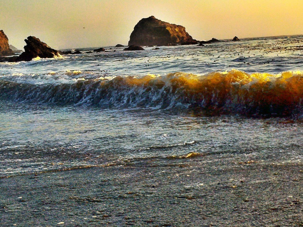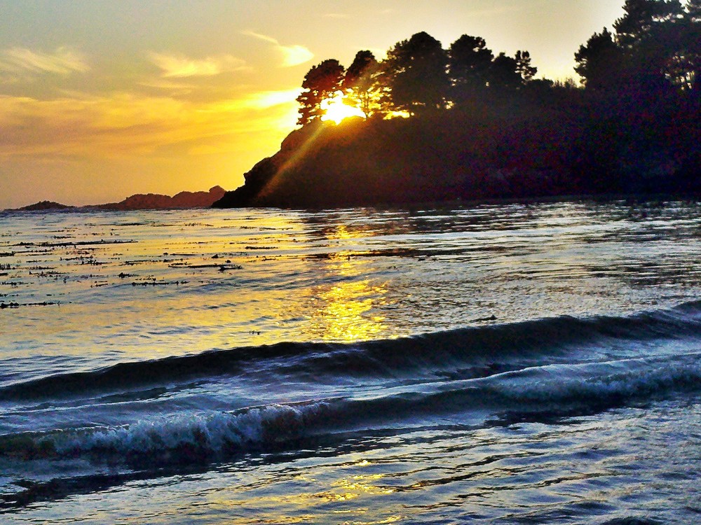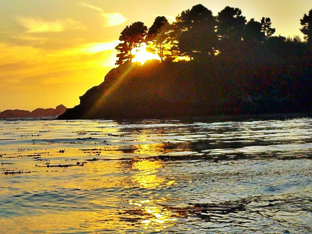 A golden band of brilliance arcs across the water, the kelp beds, the breaking surf, the harsh black sands.