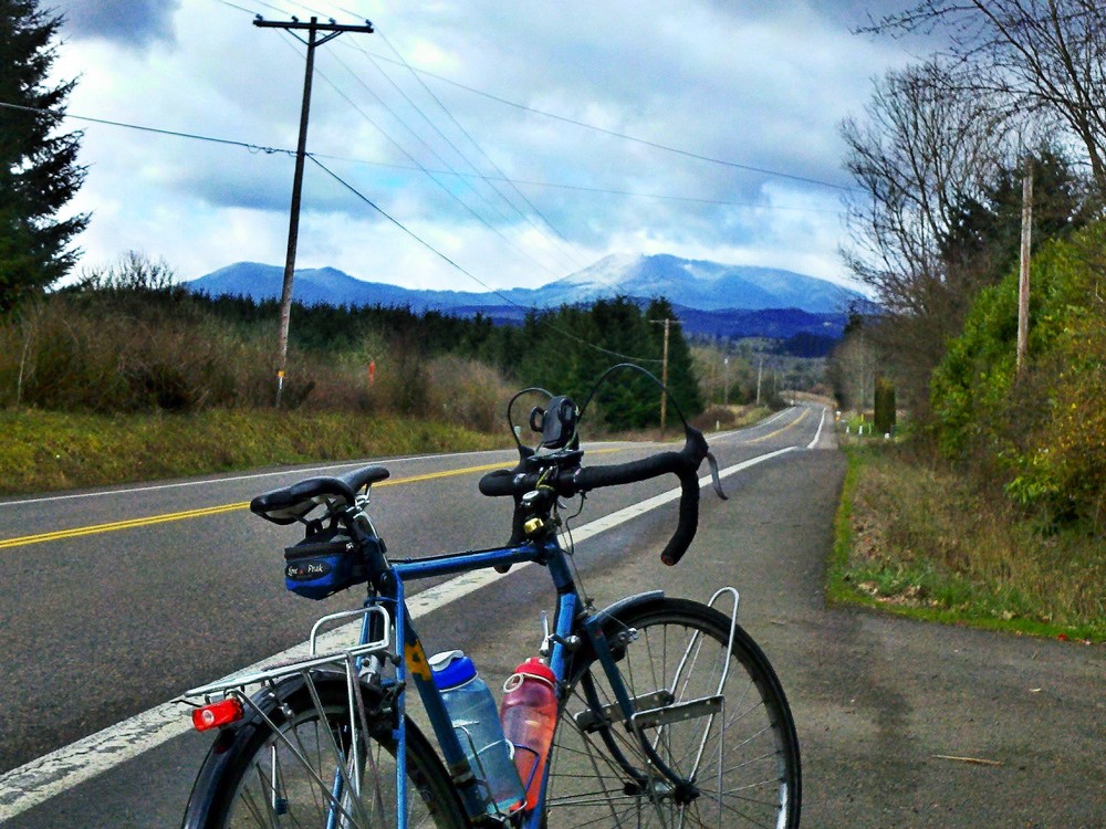 So I went out on a birthday ride. The weather broke into clouds and patches of blue, but temps never above the low 40s. A cold ride! I seemed to dodge rain and hail as I rode over West Hills Road to Philomath (that's Mary's Peak flocked in early Spring snow in the picture above), then down Fern Road to Airport, back up Bellfountain and ending at Timberhill Athletic Club, where I'd started. The spa never felt so good as when I sank my chilly limbs into the frothy hot water. Ahhhh.