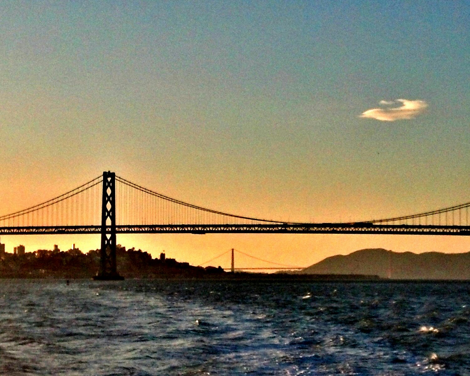 I board a ferry across the bay. I’ve managed to avoid the BART this whole trip, which is good, since there are ongoing strikes and “service problems” as talks break down between labor and administrators. I’m told the new head of BART is a cyclist living in Oakland, who lifted bicycle restrictions during rush hours. The ferry pulls under the western span of the Bay Bridge and I catch a beautiful sunset view of both the Bay and the Golden Gate. I’m noticing a growing fascination with bridges, almost a fetish? Matt Love, where are you these days? Posting ugly pictures of the Astoria Bridge. I feel for you brother. Come back to Newport.