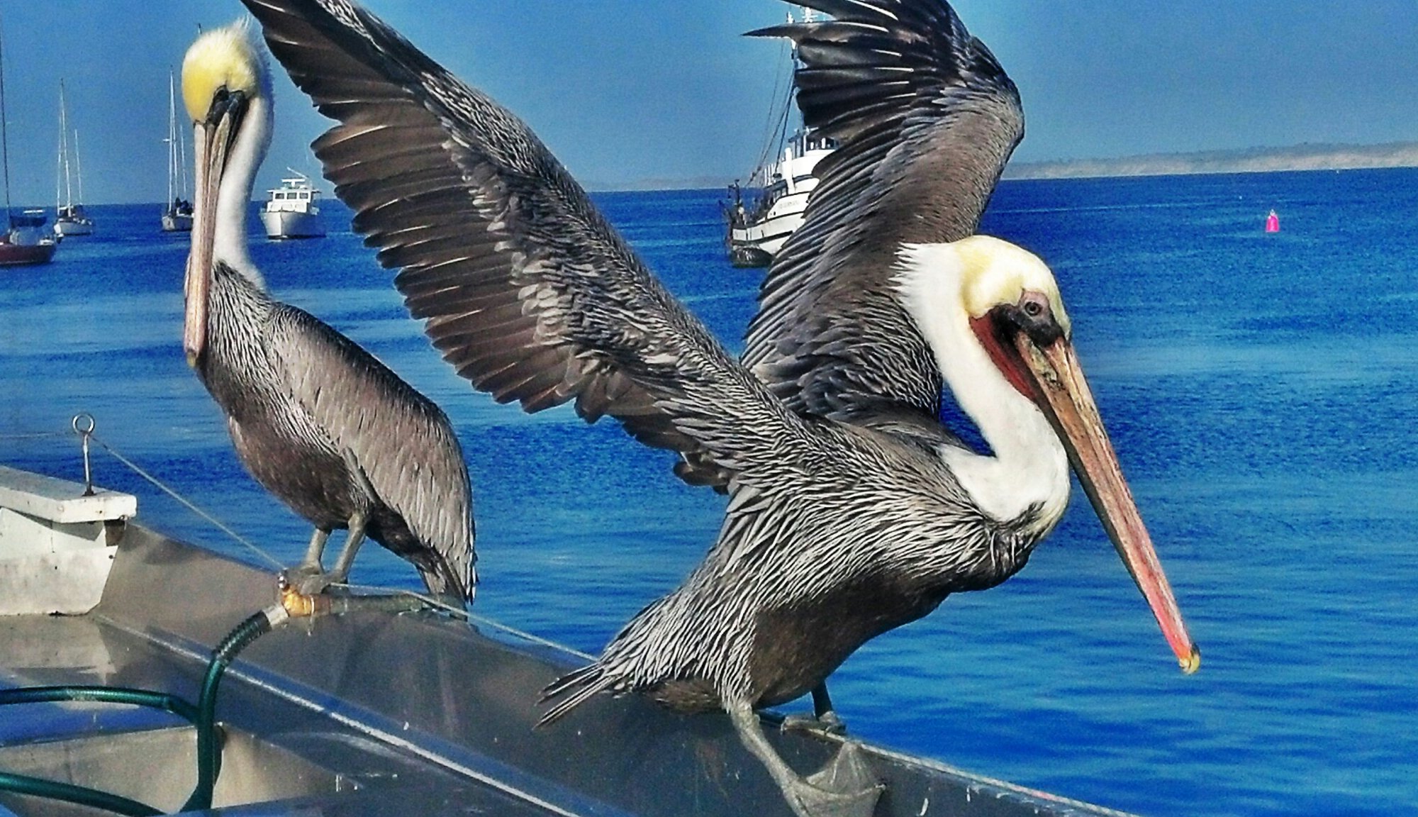 Walking along the bay path – up past the Coast Guard station and commercial wharf, to the touristy wharf filled with seafood restaurants and hawkers trying to get our business. Then we see two pelicans, right on the railing down near a fish cleaning station. We rush to get pictures, up closer to these huge birds than seems wise. The pelicans are in no hurry, regarding us strange tourists taking pictures, the yellow tinged bills tucked down against the chest, prehistoric looking eyes gazing at tourist, then fish scraps picked at by a gull. One flaps open its massive wings, falls backwards off the railing, swooping to glide along the water, just above the water, out between docked fishing boats. Alice is giggling to see these majestic birds up so closely.