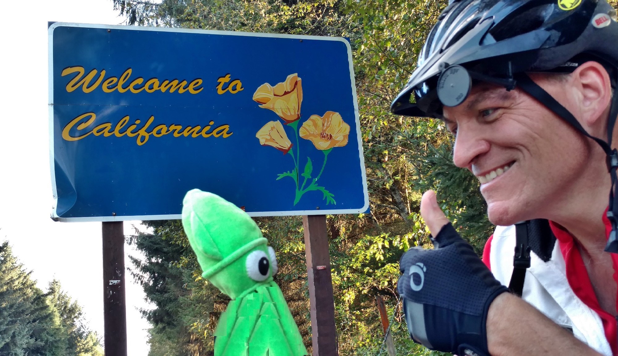 My tailwind takes me up to the California border, where I pause for selfies with Squiddie. He’s delighted to have traversed two states with me, and looking forward to a third. Two germans drive up in a used Jaguar convertible they just bought in Washington, ask me to take their picture at the border sign. We share some laughs and stories, then they roar off in their roadster. They’re having fun. I’m also having a blast, at a slower pace.