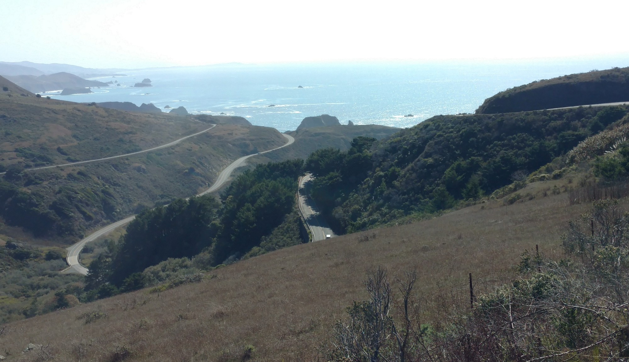 Farewell, I’m off, up the long camp road, rejoining Route 1. The sky is dreary, hung low with fog or clouds, I can’t really tell. Mr. Blue hasn’t shown today. I notice the hills immediately, straining and sweating. And I really feel the cold. A light headwind doesn’t help, as well as the anticipation of the large climbs ahead past Fort Ross.
